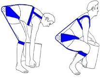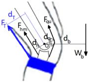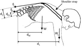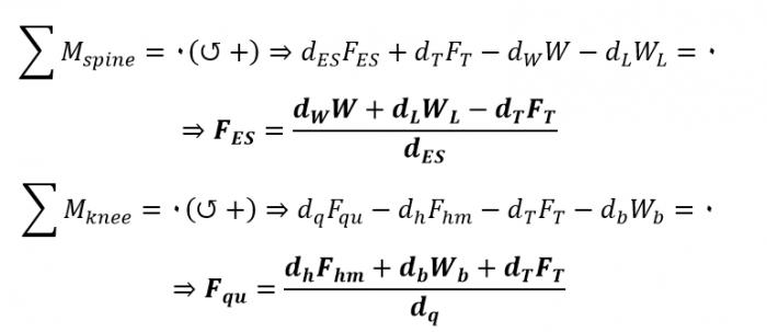 W و WL به ترتیب، وزن بالاتنه (بالای ستون فقرات) و بار خارجی روی دست فرد هستند. Wb وزن قسمتی از بدن میباشد که بالای زانو قرار دارد. FES، Fqu و Fhm نیز به ترتیب نیروهای گروه عضلانی ارکتور اسپاین (راست کننده ستون فقرات)، چهارسرران و همسترینگ هستند. فاصله عمودی تک تک نیروهای مذکور نیز تا مرکز مفاصل مربوطه با پارامتر d بهمراه اندیس مربوطه نشان داده شدهاست. با نوشتن معادلات تعادل گشتاوری حول مفاصل ستون فقرات و زانو در حالت استاتیکی داریم (جهت پادساعتگرد یا اکستنسور هر دو مفصل مثبت فرض شدهاست):