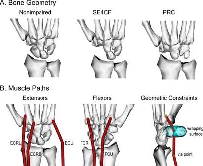 شکل بالا شبیه سازی اسکلتی عضلانی دو جراحی رایج برای درمان آرتروز مچ دست که عبارتند از کارپکتومی ردیف پروگزیمال و فیوژن چهار گوشه اسکافوئید. خطوط قرمز رنگ مدل های تاندونی عضلانی هستند.